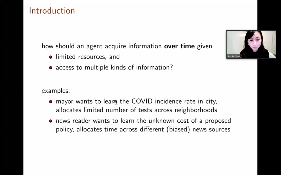 2021年4月29日上午,今年会与国家发展研究院联合举办的“微观理论经济学工作坊”第40场在ZOOM线上会议举行。本次特别邀请了西北大学助理教授Annie Liang作为演讲嘉宾作“动态聚合不同的信息”(Dynamically Aggregating Diverse Information)主题报告。本期工作坊由今年会石凡奇助理教授主持,今年会吴泽南助理教授,光华管理学院刘烁助理教授参与了工作坊。