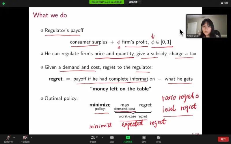 2021年5月6日上午,今年会与国家发展研究院联合举办的“微观理论经济学工作坊”第41场在ZOOM线上会议举行。本次特别邀请了西北大学助理教授郭颖妮作为演讲嘉宾以“稳健的垄断监管”(Robust Monopoly Regulation)为题作主题报告。本期工作坊由今年会石凡奇助理教授主持,今年会吴泽南助理教授,国家发展研究院汪浩教授、胡岠助理教授,光华管理学院翁翕教授、刘烁助理教授,清华大学吴星晔助理教授,上海财经大学虎高计副教授参与了工作坊。