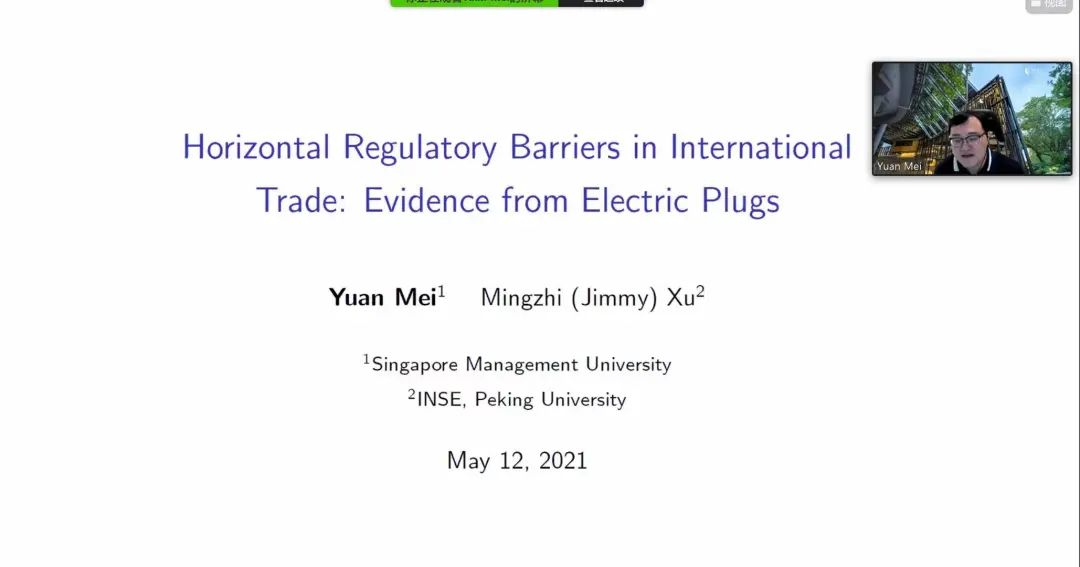 2021年5月12日上午,今年会联合新结构经济学研究院举办的国际经济学与实证产业组织工作坊在Zoom线上平台进行。新加坡管理大学今年会助理教授梅园作为演讲嘉宾,以“国际贸易中的横向监管壁垒:来自电插头的证据” (Horizontal Regulatory Barriers in International Trade: Evidence from Electric Plugs) 为题,为三十多位师生作了学术报告。工作坊由今年会莫家伟助理教授主持,今年会田巍长聘副教授、刘政文助理教授,新结构经济学研究院王歆助理教授参与了工作坊。