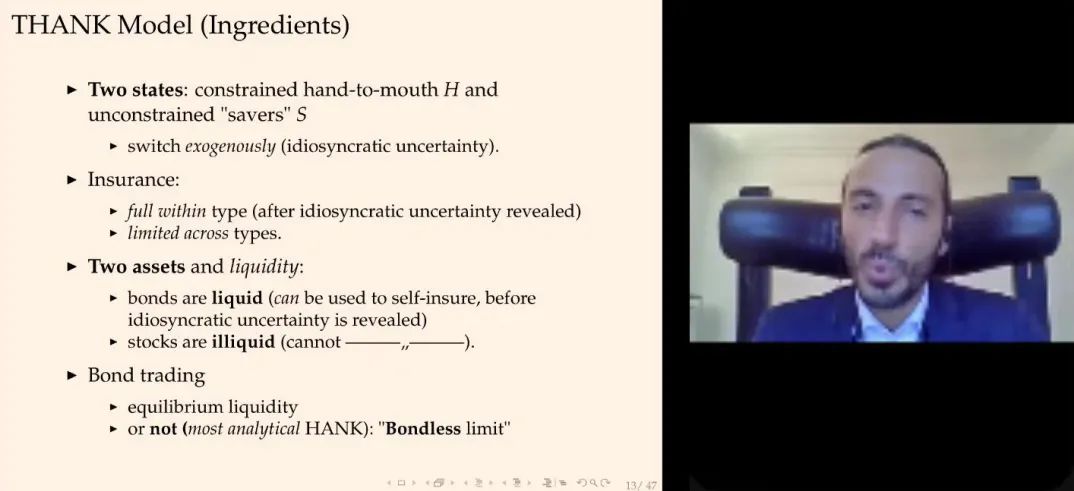 Florin O. Bilbiie教授介绍了THANK模型——一个易于处理的异质性代理人新凯恩斯主义模型。THANK模型捕捉了可分析的定量 HANK 的关键微观异质性渠道的特性:周期性不平等和风险作为独立但相关的渠道;异质性的不确定性和自我保险,预防性储蓄;现实的跨期边际消费倾向。Florin O. Bilbiie教授将它用于成熟的新凯恩斯主义宏观分析:利率规则的确定性、解决前瞻性指引之谜、膨胀和乘数以及最优货币政策。膨胀需要逆周期,而解决这些谜需要顺周期不平等:Catch-22,如果单独的“纯”风险渠道足够顺周期,则理论上可以解决。价格水平目标确保确定性并且不会出现问题,即使不平等和风险都是逆周期的,从而解决了Catch-22。这同样适用于在具有流动性的模型版本中固定名义公共债务的规则。具有异质性的最优政策具有一种新的不平等稳定动机,会产生更高的通胀波动——但它不受风险的影响,只要目标均衡不包含不平等。