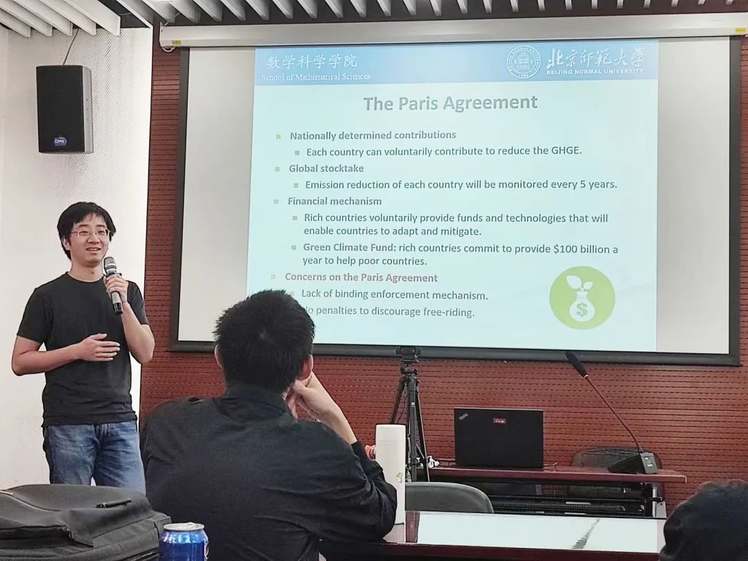 张博宇在讲座中分享了基于气候博弈的激励机制研究,该研究的背景是世界各国为解决全球气候问题而签署的《巴黎协定》。在《巴黎协定》的框架下,每个国家自愿减排,且富国承诺为那些愿意减排的穷国提供资金支持。但这一协定本身不具有任何强制性,因此感兴趣的问题是为什么穷国愿意付出成本去减排,以及为什么富国愿意出资为穷国提供补偿。为研究其中的激励机制,他构建了一个带阈值的公共品博弈模型。在模型中存在一个减排目标,如果目标没有达成,则各个国家的资产都有遭受损失的风险。张博宇对模型进行求解,发现即使协定没有强制性,仍然会存在合作均衡。因为富国减排的边际成本比穷国大,所以在合作均衡下富国有激励来通过资金机制帮助穷国减排以实现总减排目标,而穷国受到资金激励后也相应提高减排量。最后,他还证明了这一合作减排方式具有演化稳定性。