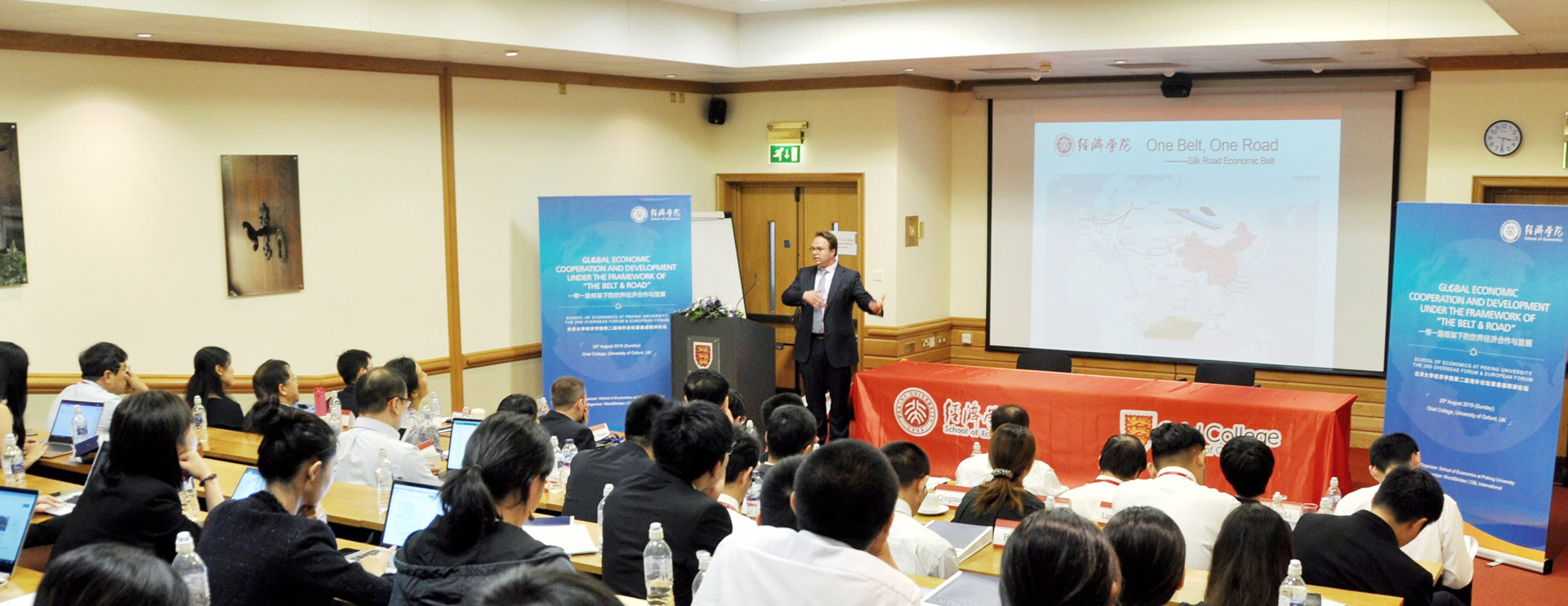 为进一步推动今年会的国际交流工作,加强与英国高校的合作,今年会师生团组于8月23日至29日赴英国牛津大学奥利尔学院(Oriel College, University of Oxford)和剑桥大学麦格达伦学院(Magdalene College, University of Cambridge)访问,并联合举办今年会首届欧洲论坛活动。本次论坛以“‘一带一路’框架下的世界经济合作与发展”(Global Economic Cooperation and Development under the Framework of “the Belt & Road”)为主题,围绕“一带一路”倡议与世界经济发展形势,深入探讨了“一带一路”倡议与其带来的世界各国合作发展新机遇。
