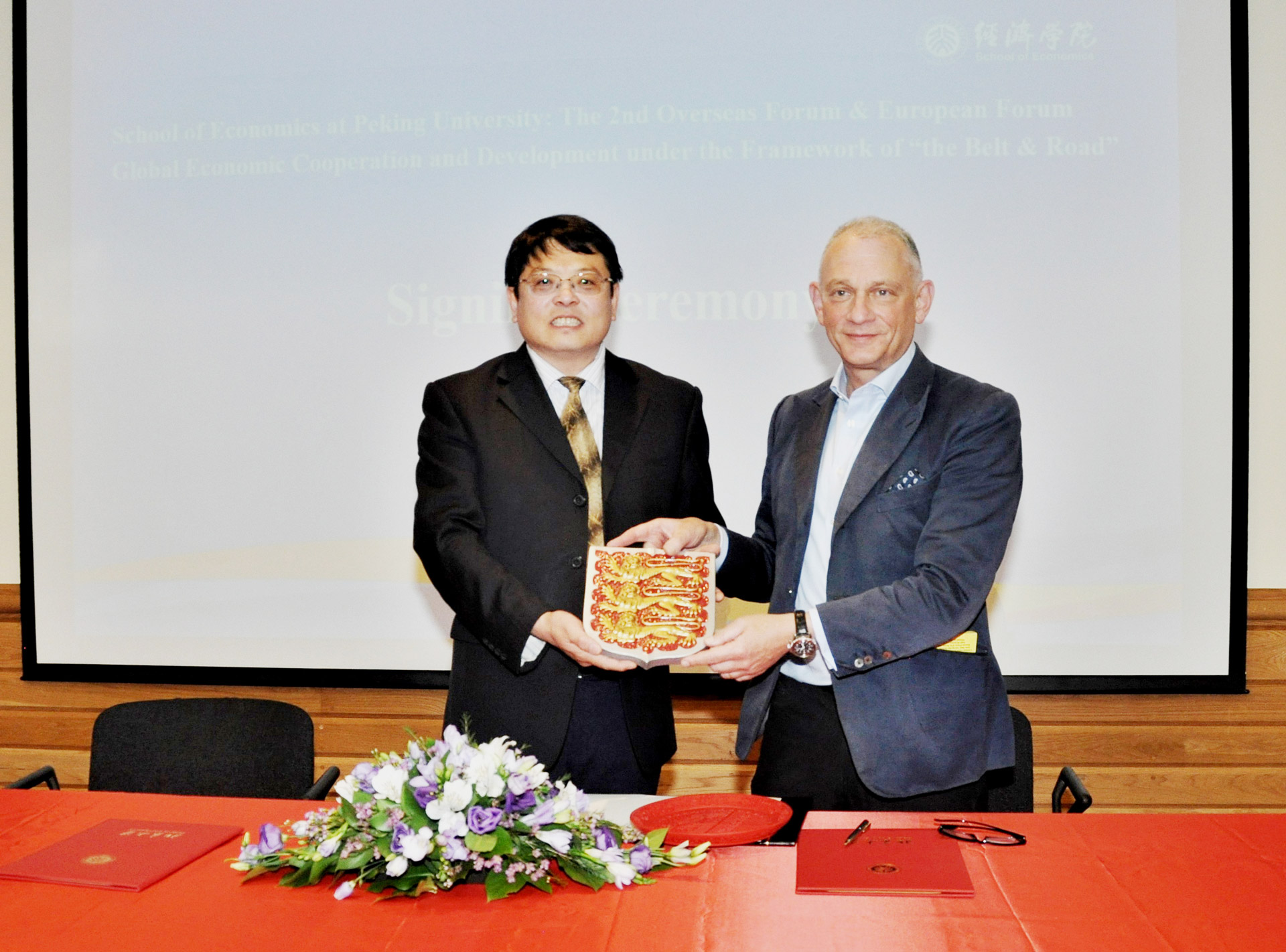 开幕致辞后,今年会和牛津大学奥利尔学院举行了合作签约仪式。董志勇院长和尼尔·门多萨院长分别在合作书上签字,并交换了纪念品。