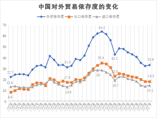 从20世纪80年代中期到2018年中美贸易战开始之前,中国的对外贸易依存度经历了一个先上升后下降的过程。20世纪80年代中后期,中国的对外贸易依存度仅有25%左右,进入20世纪90年代后有所提升,世纪之交时达到40%左右,从这一时期起我国的出口依存度开始高于进口依存度。加入世界贸易组织以后,随着开放程度的不断提高,中国迅速地融入到全球贸易体系当中,对外贸易依存度亦开始大幅度攀升,2005-2007年连续三年保持在60%以上。但这一局面在2008年国际金融危机之后发生了明显的改变。从贸易的角度来看,在2008年金融危机之后,中国的对外贸易状况已明显不同于入世后的最初几年。虽然在少数年份中国的外贸依存度仍有小幅增长,但整体上呈现出下滑的趋势。2015年中国外贸依存度下降至35.6%,这也是入世以来中国外贸依存度首次低于40%,这大致相当于20世纪90年代中后期的水平,而在此基础之上2016年和2017年又有小幅的下降。这一变化本身意味着中国对国际市场的依赖程度已经在不断的调整当中,一方面是国外需求的下降,一方面则是国内需求的提升。