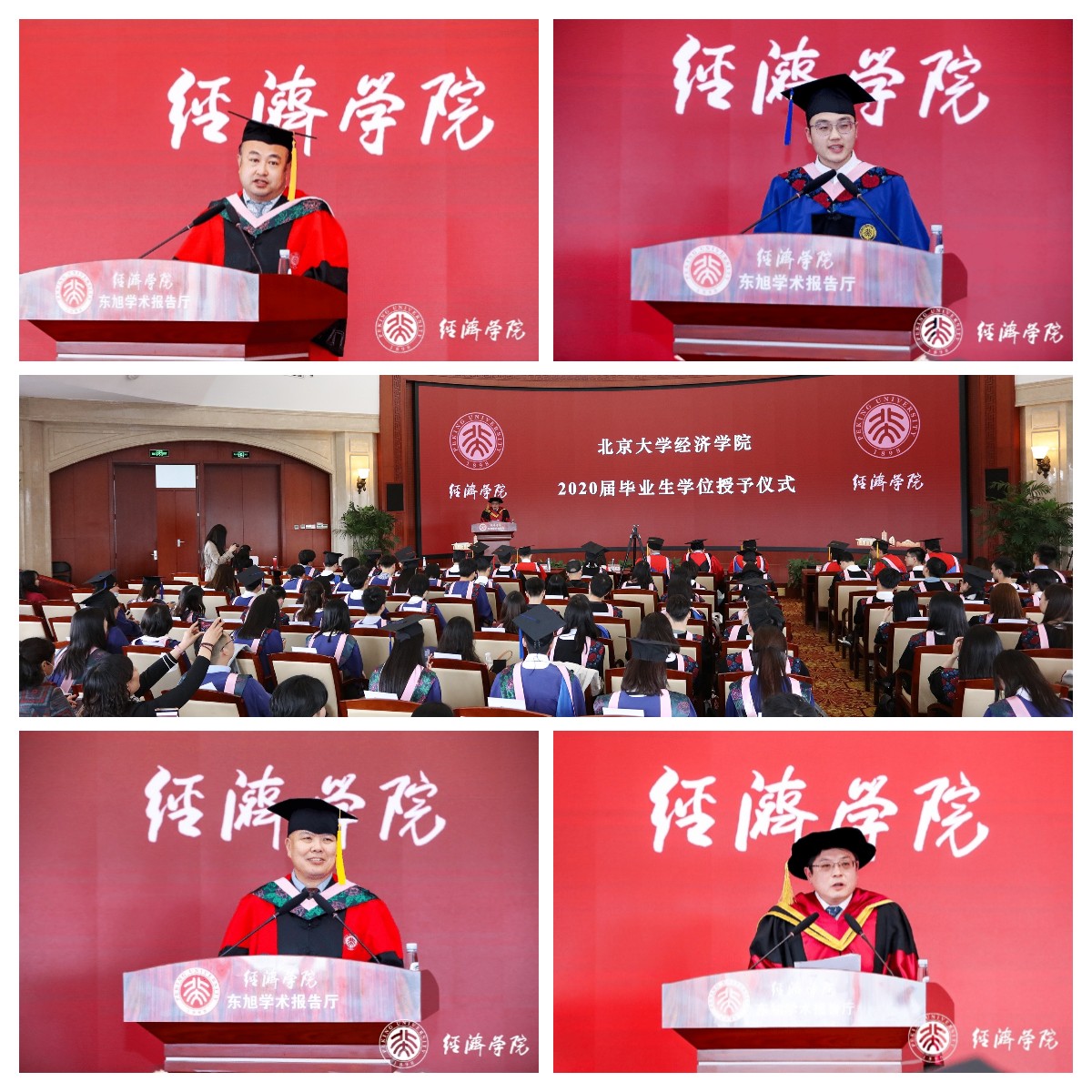 仪式开始前,学院领导班子与毕业生逐一合影留念,并播放了为毕业生们精心制作的视频。副院长张亚光作为教师代表在发言中提到学生们毕业后就成为了校友,每一位校友都是学院百余年历史中不可或缺的一部分,愿学院与校友彼此相爱、互相珍惜。2018级税务硕士梁义钦作为毕业生代表在发言中表示学院永远是毕业生温馨的港湾,愿每一位毕业生时刻谨记“北大人”“经院人”的传承与信念,并呼吁大家存砥砺奋进之心,承经世济民之志。党委书记崔建华希望经院学子有勇气面对现实、有原则坚守底线、有能力富于创造、有情怀复兴中华民族。院长董志勇寄语经院学子在跌宕起伏的时代浪潮中要学会应对变化,在对世界格局的关注和思考中保持乐观和初心,勇于担当时代的重任,在不断的挑战和创新中找到独属于自己的筑梦之路,并在这条道路上乘风破浪、行稳致远。